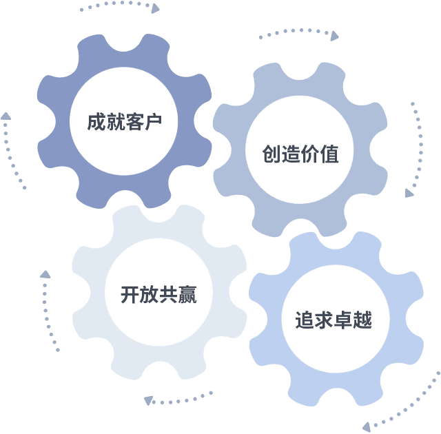 成就客户是一切决策的出发点,,创造价值是衡量所有工作的标准,,,追求卓越是我们做事做人的态度,,开放共赢是我们的格局也是最终的结果。。。价值观的齿轮环环相扣,,,推动着组织里的每个人不断向前。。。。